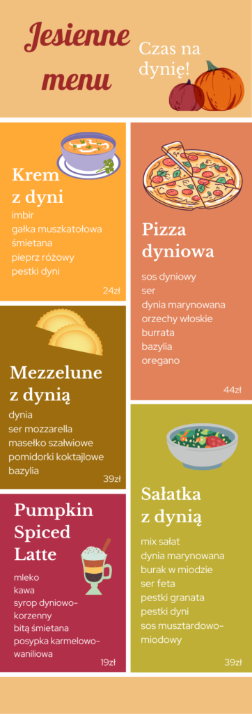 30 sierpnia, 2025 by Manager Jesienne menu czeka już na Państwa w naszej restauracji! W tym roku na talerzach tradycyjnie króluje dynia w czterech odsłonach. Pyszne dania dopełni latte z syropem dyniowo-korzennym. Zapraszamy!